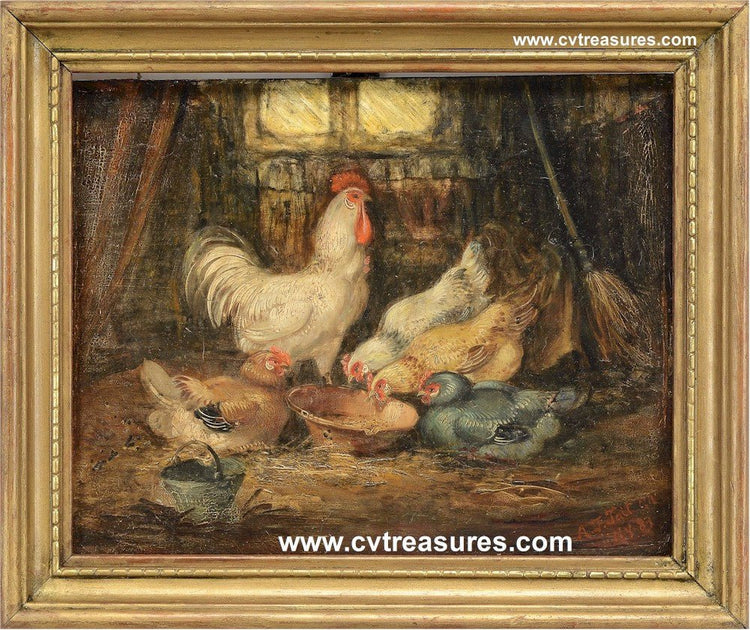 ARTHUR FITZWILLIAM TAIT Vintage Fine Art Barn Animal Painting ROOSTER AND CHICKENS IN BARN INTERIOR