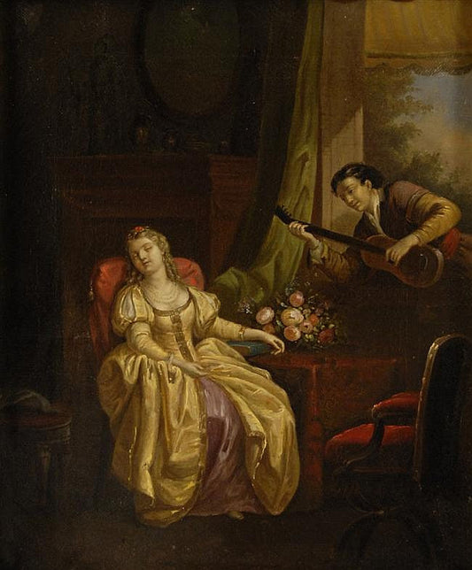 Continental School "Lady Being Serenaded" 19th century antique oil fine art painting