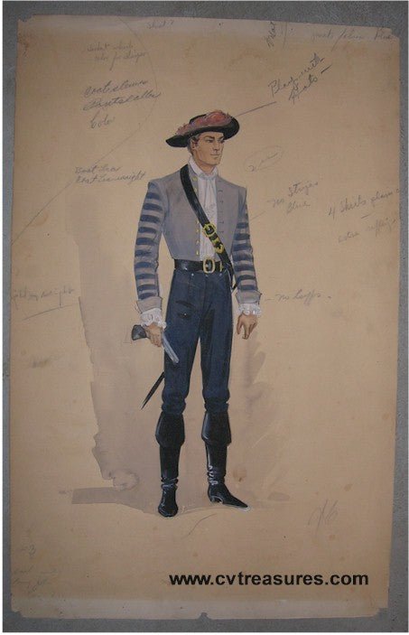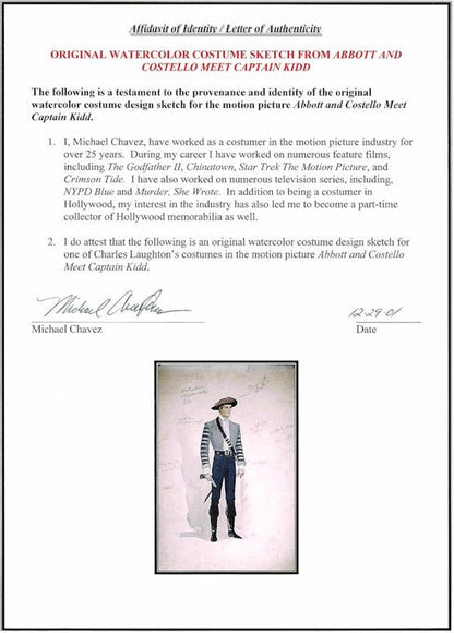 This is an original costume design sketch for one of Charles Laughton's costumes in the classic film Abbott & Costello Meet Captain Kidd. The color sketch is composed of ink pen, pencil, and watercolor and features the original design notes on the front. It is done on heavy design paper and measures 20" tall by 13" wide.