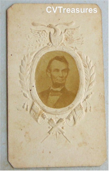 Rare 19th century photo of Abraham Lincoln. Carte de visite with a wonderful embossed patriotic motif. Original Photograph negative was taken by Anthony Berger in Washington, D.C., on February 9, 1864. Extraordinary ornate Civil War theme embossed CDV card.
