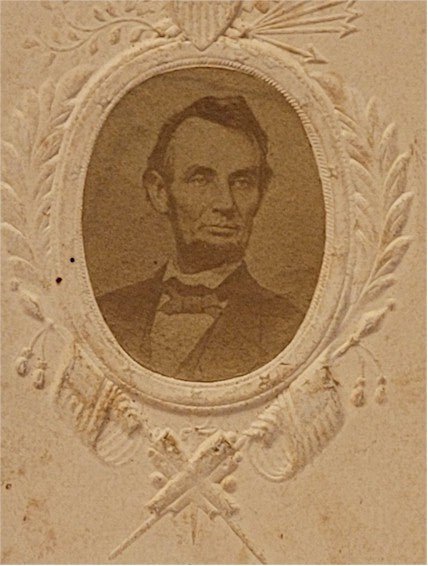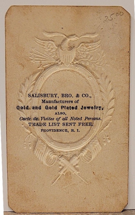 UNCOMMON CARTE-DE-VISITE PHOTOGRAPH OF ABRAHAM LINCOLN CA. 1865. Providence, RI: Salisbury, Bro. & Co. [n.d. ca. 1865] "Manufacturers of Gold and Plated Jewelry, Also, Carte de Visites of all Noted Persons." Pale embossed paper mount is 4 x 2 1/2 inches, with 1 3/8 x 1 1/8 inch oval photograph, a bust of a bearded Lincoln. Very good, light soil to the mount. The embossed design features an eagle, laurel leaves, flags, shield and cannons. The photo is in very good-excellent condition.