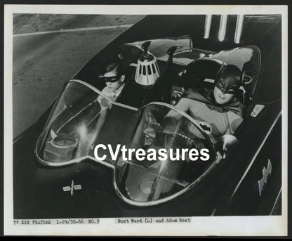 1966 Large and beautiful photograph from the famous television program "Batman" and showing the two stars of the show behind the wheel of the famous Batmobile. A work of television art, this is the only example we have ever seen, completely vintage to 1966, and in nice shape. This is easily one of the coolest images from the show we have ever seen! Has dated studio network stamp on back.