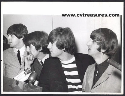 A Vintage 1964 Original Photograph capturing the Beatles in the landmark year of '64 when they invaded American soil and launched "Beatlemania" in the United States. This terrific shot captures the Boys from Liverpool being interviewed after landing. Shown are John Lennon, Paul McCartney, Ringo Starr and George Harrison. The photo is a RARE, vintage LARGE-format photograph measuring a whopping 14" in width and is from "The Cinema Screen" collection, one of the FINEST private holdings of original antique entertainment photographs ever assembled. There are some vertical creases on the right section of the photo by Ringo. The central image overall is nice. Large-format vintage photos of the Beatles are very scarce.