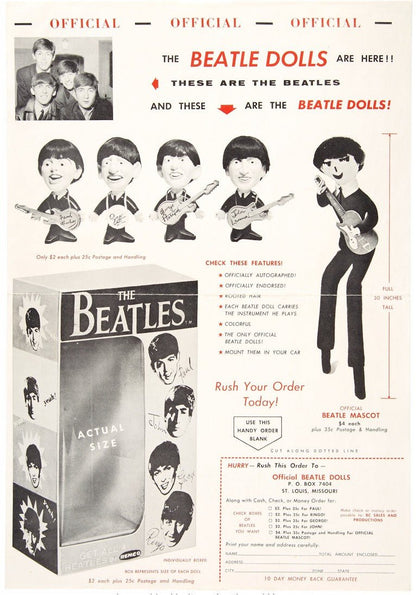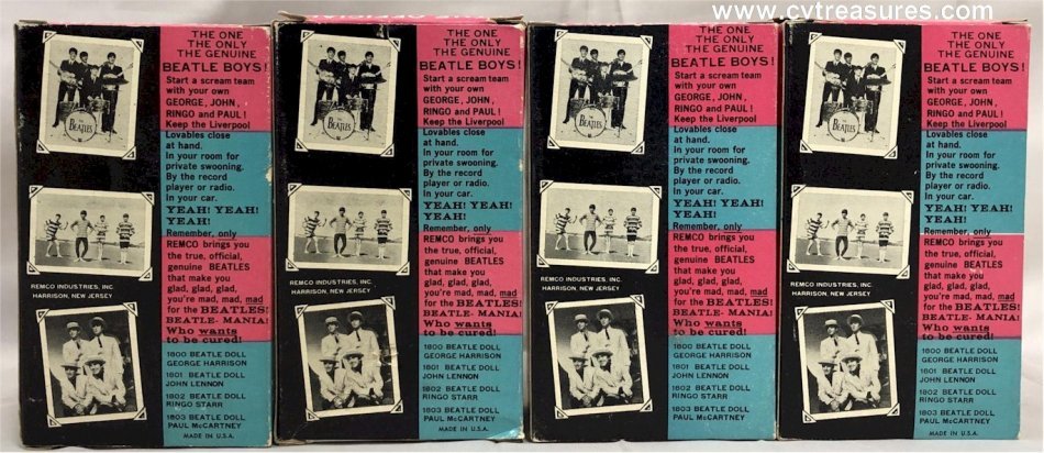 Each box measures approx: 6 1/2" by 3 3/4" by 2". We love the text on the back of each box: "The one, the only, the genuine BEATLE BOYS! Start a scream team with your own GEORGE, JOHN, RINGO, and PAUL! Keep the Liverpool Lovables close at hand. In your room for private swooning. By the record player or radio. In your car. YEAH! YEAH! YEAH! Remember, only REMCO brings you the true, official, genuine BEATLES that make you glad, glad, glad, you're mad mad, mad for the BEATLES! BEATLE-MANIA! Who wants to be cured!" They just don't write copy like that anymore. Boxes have general wear and a few bends overall Excellent Plus condition or better. Dolls appear to be unused New Old Store Stock.