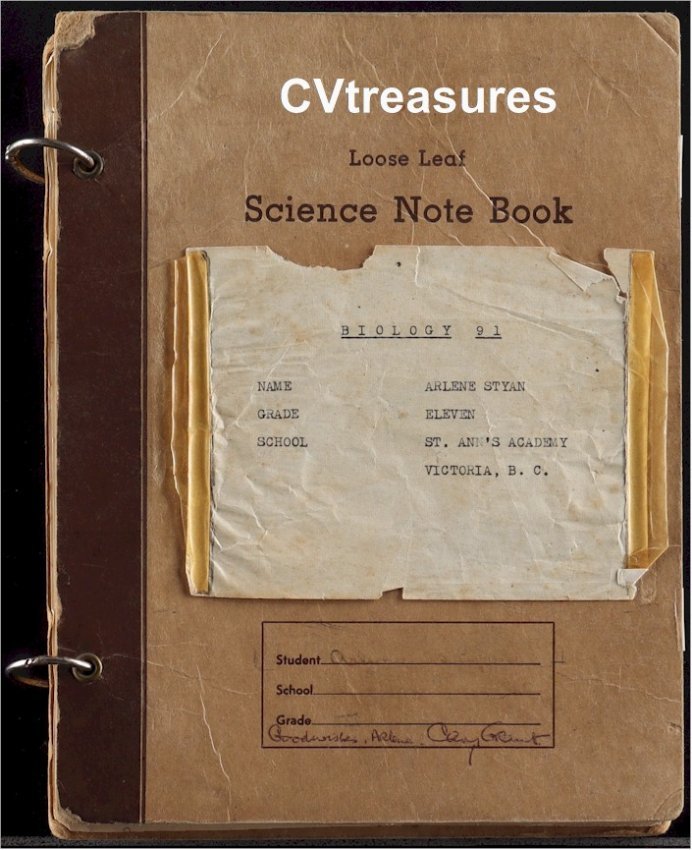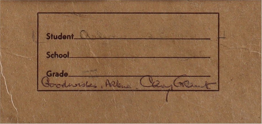 The autograph has a very amusing story behind it. When Cary Grant was filming "An Affair to Remember" in British Columbia in 1957, he was taking a taxi to the set. The taxi driver recognized Mr. Grant and asked him for an autograph. Mr. Grant said he would, but neither of them had any paper! The driver searched his cab and found his daughter's loose leaf science note book (which she had accidentally left when he dropped her off at school), and Mr. Grant wrote on the bottom of the cover "Good wishes, Arlene, Cary Grant", because Arlene was the driver's daughter. This is the entire school book, including the cover with Mr. Grant's autograph.