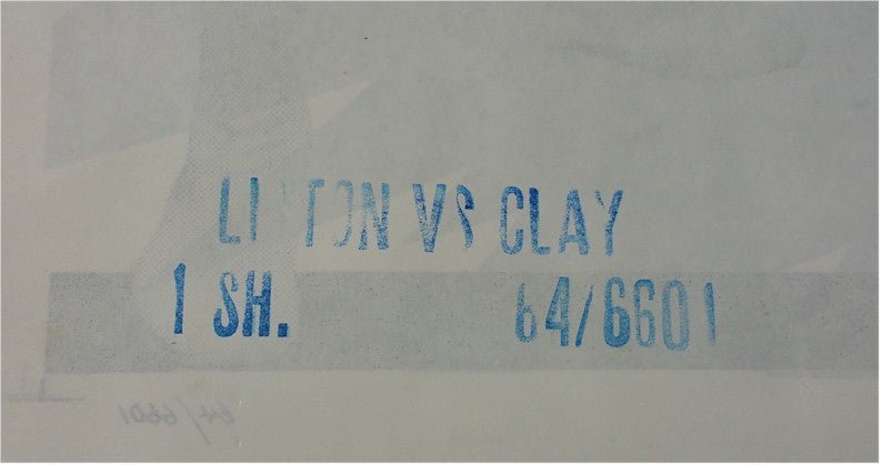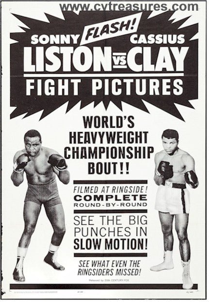 So popular was the Clay vs. Liston bout in 1964 in which Ali won the title, that it was released in film format to movie theaters later that same year. One-sheet movie poster with full length images of both warriors. heralds "Flash! Sonny Liston vs. Cassius Clay. Fight Pictures. World's Heavyweight Championship Bout!!...See the Big Punches in Slow Motion!"