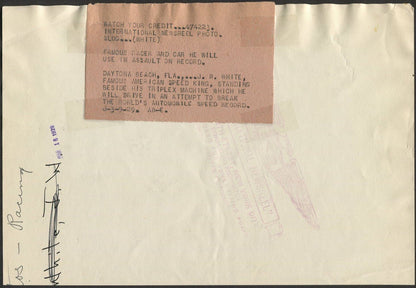 1929 Vintage photograph of speed king J.H. White as he poses with his HUGE Triplex racer as he sought to set a new land speed record in Daytona. An incredible car and a fantastic piece of racing history, issued by the International News and stamped on the back with a detailed paper caption as well. Photo has a few corner creases but otherwise it is quite nice.
