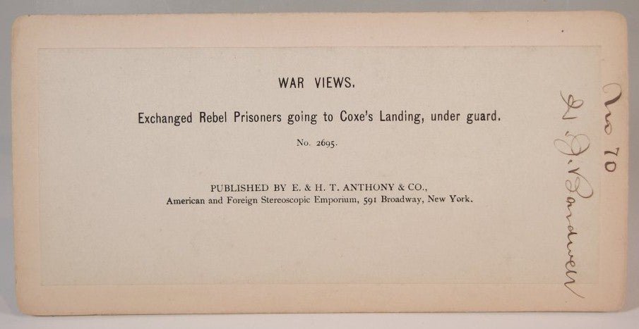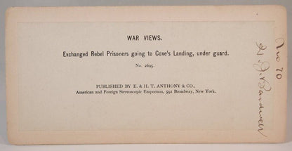 The outstanding Photo is titled on the label at the back "War Views / Exchanged Rebel Prisoners going to Coxe’s Landing, under guard. / No. 2695". The Stereoview is from “The War For the Union” Series taken by Brady Photographers. The Stereoview offered here, was printed from Brady’s original negatives and published by E. & H. T. Anthony.