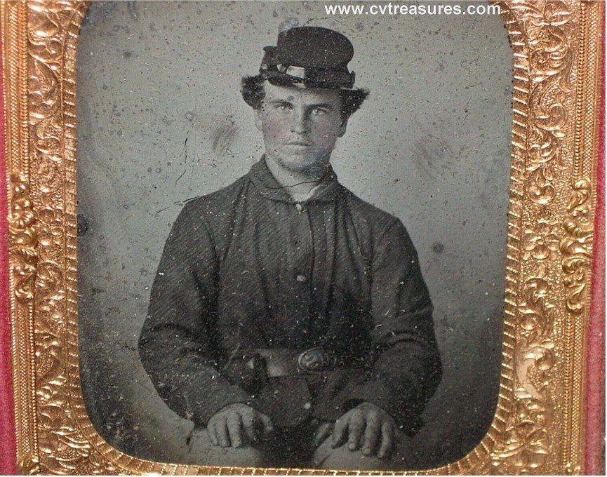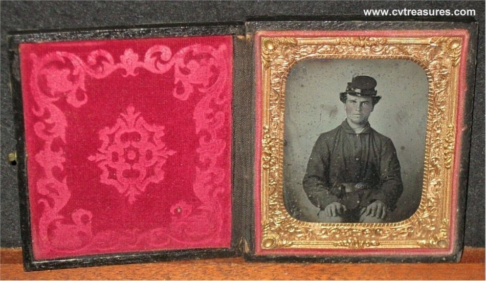Here is a 1/6th plate ambrotype photo of Civil War Soldier in his uniform. The image is clear & crisp. The photo was in a box with other pictures and note in box stated J.C. Garner was in civil war uniform. Comes in a case. The case is separating from the other half at the seam. Overall measures 3 5/8" x 3 1/4"