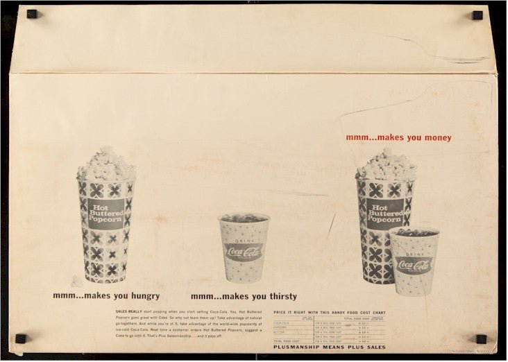 Film Description: Coca-Cola: Hot Buttered Popcorn & Coke, the mid 1960s theater advertising packet ("Things go better with Coke"; "mmm...makes you hungry mmm...makes you thirsty mmm... makes you money") containing a variety of advertising items.