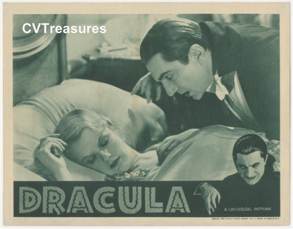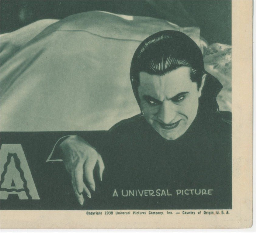Not even any of the 1931 lobby cards (which typically sell for $10,000+ Each when they rarely do surface on the market) , compares to this incredible image of the Count moving in on his sleeping prey (Hellen Chandler) in the very first Dracula re-release from 1938. .And if that''s not enough, look at the striking and menacing border image of Lugosi in the lower right... Simply astonishing to say the least. And one of the best Dracula lobby cards we have ever seen surface.