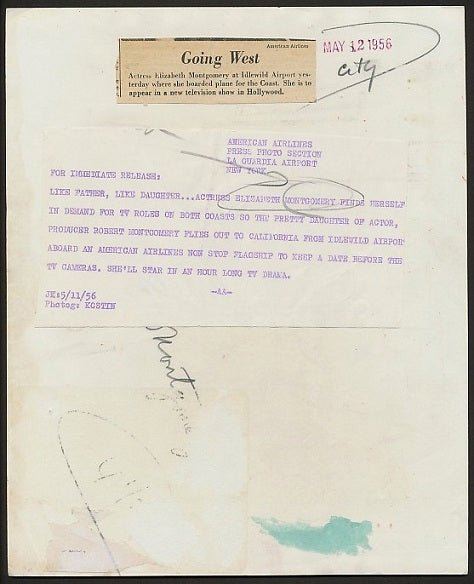 Here is a Rare Vintage 1956 ORIGINAL Photograph featuring an early image of Elizabeth Montgomery. Fine 8" x 10" publicity photo issued by American Airlines with the caption and stamp date on the verso as well as a newspaper clipping as this one was used in newspaper publication at the time. America’s favorite television witch was also one of the most beautiful women to ever appear on the tube !