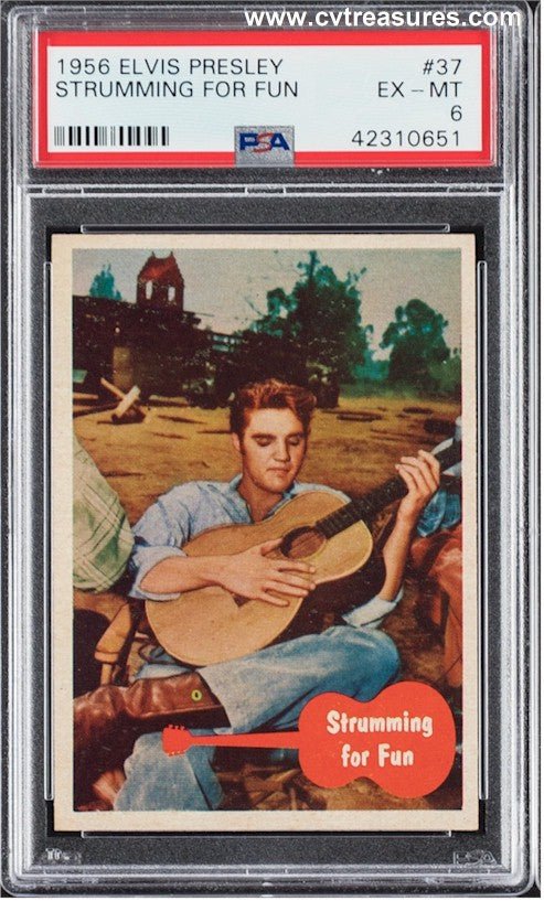Rare Card #37 . PSA authenticated and graded a NM 6. This beautiful vintage Topps Gum card as issued in 1956 was the image used in some of the original movie posters and promotional material for Elvis's Very First movie, "Love Me Tender". Beautiful image of Elvis playing the guitar. . . A gem ! * See enlargeable images above and below