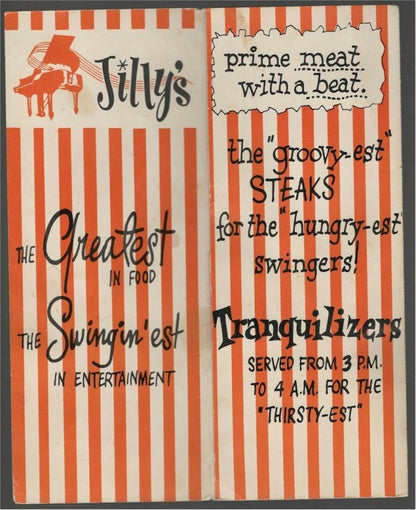 In the mid-1960's, Frank's favorite New York bar was Jilly's Saloon (256 West 52nd Street - currently closed). Sinatra met Jilly in Miami Beach when performing at the Fontainebleau. They hit it off immediately.