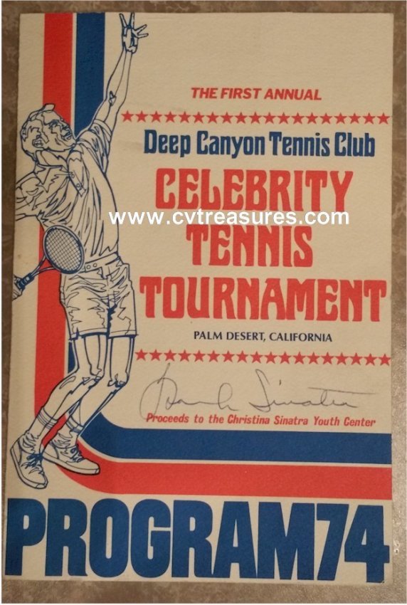 Signed UNpersonalized, "Frank Sinatra", on the front cover in the perfect location in bold ball point pen. Program is in near mint-mint condition and was well preserved. Since I acquired it 20 years ago, it has been in a dry humidity controlled safe. Come with a terrific letter of provenance from the original owner chronicling his meeting My Sinatra when the recipient was nine years old and was working as a “ball boy” for the Christina Sinatra Youth Center Charity Tennis Tournament.