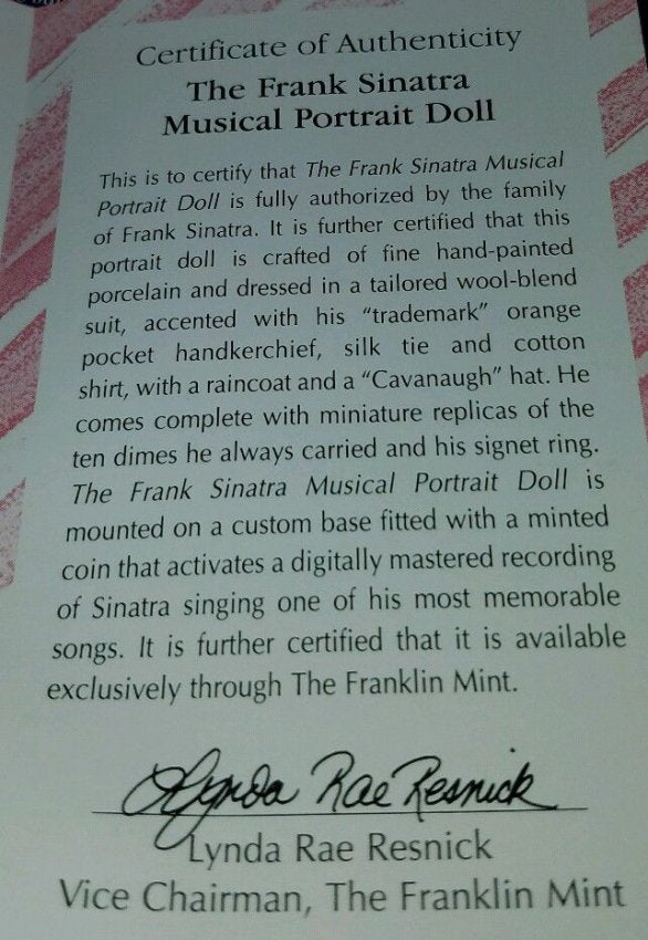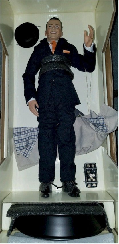 Just a few months after the "Chairman of the Board" passed away in 1998 the Franklin Mint with authorization from the Sinatra Family issued this wonderful Singing Porcelain 19" figure of Mr Sinatra with the tuxedo and hat he wore in "Pal Joey" and even the dimes he always carried in his pocket. I personally bought three of three of these and as we are getting ready to move are selling two of them and keeping one. And , I am selling for less than I paid for a Special Price of only $135. In the original box, with all documents, Never Opened!