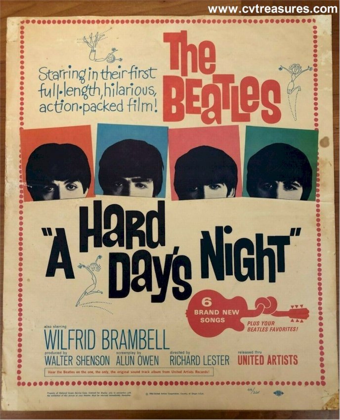 14x18" stiff paper for the original 1964 release of the British musical comedy film directed by Richard Lester and starring The Beatles - John Lennon, Paul McCartney, George Harrison and Ringo Starr - during the height of Beatlemania. Originally released by United Artists, the film portrays a couple of days in the lives of the group. The film is considered to be one of the best and most influential musical films of all time. Card features photos of all four Beatles w/just the top of their faces showing, along w/cartoon images of girls jumping and dancing. Lower right notes "6 Brand New Songs."
