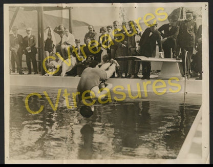 Rare 1923 photograph of Harry Houdini diving into a swimming pool in Los Angeles at the Ambassador Hotel. It would be his last outdoor stunt of his life and one of his most famous. Issued by Wide World Photos and stamped on the back, the photo also carries a long paper caption that goes into detail about the event. This is one of the only images from this event that we have ever seen and this example is being offered here for the first time ever, fresh out of a newspaper archive. There are some pinholes at the corners from editorial use and a light crease on the left side, but overall the photograph presents really well. With impeccable provenance on back.
