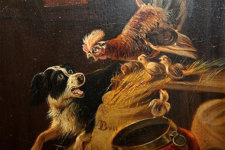 Stunning beautiful oil painting on board of barn interior with a hen protecting her chicks from a dog. Unsigned.