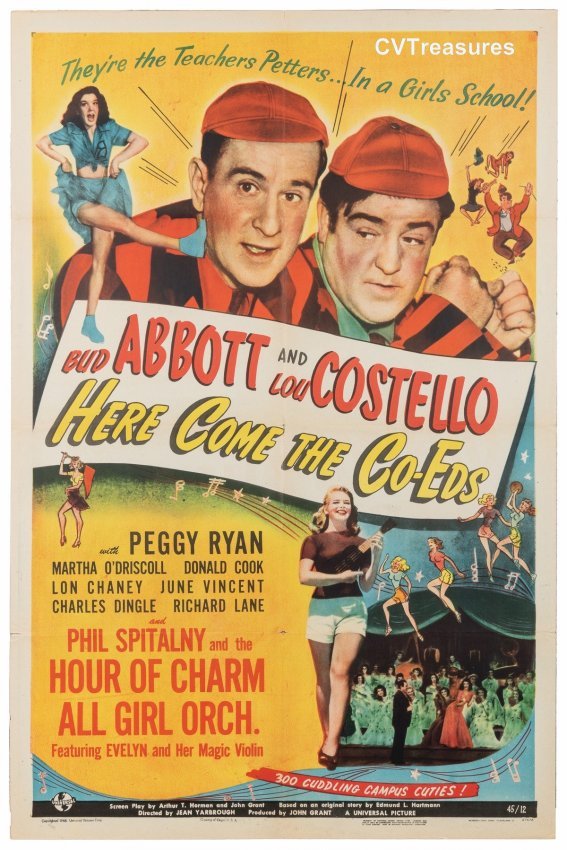 Starring Bud Abbott, Lou Costello, Lon Chaney Jr., Peggy Ryan, Martha O'Driscoll, June Vincent, Donald Cook, Charles Dingle, Bill Stern, Phil Spitalny, and Evelyn. Directed by Jean Yarbrough. An unrestored poster with good color and an overall very presentable appearance