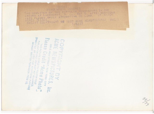 Very rare original First Generation press release photos of the Hindenburg disaster. We just acquired a collection of original Hindenburg photos taken on the day of the explosion in Lakehurst NJ. These are photos used on the very day of the crash, May 6, 1937. It was a day that will forever be part of the history books. And, this photo captured that catastrophic event and were immediately used for publication in newspapers around the world. The back of each has the original news snipe along with the original ACME Newspictures stamps and United Press Newspictures stamps.
