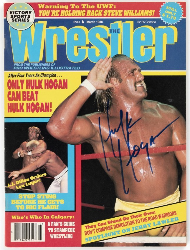 8-1/8x10-7/8" magazine w/68 pages. Published by G.C. London Publishing Assoc. March 1988. Front cover features photo of 2-time WWE HOF member Hulk Hogan is his famous pose w/his hand to his ear. Hogan has boldly signed in blue felt tip pen across his chest. Magazine has some pinch creases to spine, lt. corner tip wear and pages have evenly tanned w/age. Last two pages and back cover have matching .25" edge tear. Fine overall. Comes with JSA COA.