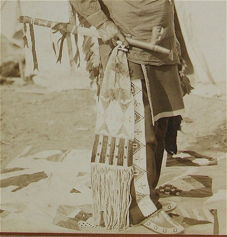The Image is a striking, full length, standing, profile portrait of the proud Oglala Chief wearing a full length, eagle feather headdress, loop style breastplate, bead decorated wool leggings and bead decorated moccasins. In his right hand he holds a pipe with wonderfully decorated stem and catlinite bowl and a stunningly beautiful, massive size bead and quill decorated hide Tobacco Bag.