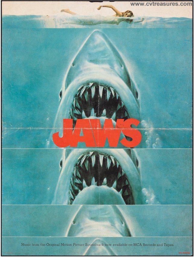 Seasoned collectors have watched the 1975 Original “Jaws” one sheet movie poster skyrocket in value in the past few years. But few, have seen this Rare Teaser/Soundtrack Gem we just listed here. Based on the one or two we could find, this poster has been referred to as a Jaws Teaser and a Soundtrack Poster. Most likely some people call it as Teaser since this poster was produced Before the film and Before the film’s regular One Sheets. Either way, it appears it was primarily used to promote the award winning and immortal iconic “Jaws” soundtrack and the spine tingling music that to this day practically every living person can immediately associate with “Jaws”.