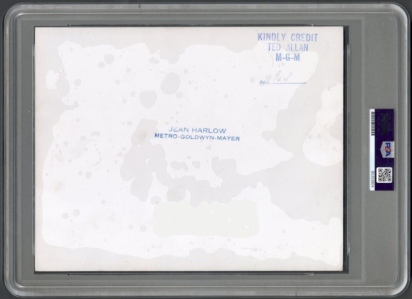 Large 1936 studio photograph of actress Jean Harlow from her film "Libeled Lady" and photographed by Ted Allan from MGM and stamped on the back. This is a fantastic image in great shape which can only be described as a work of Hollywood art! The condition and quality are nice and this is one of the most visually stunning Harlow images we have ever offered. A large piece of history in great shape and encapsulated by PSA as a Type 1.
