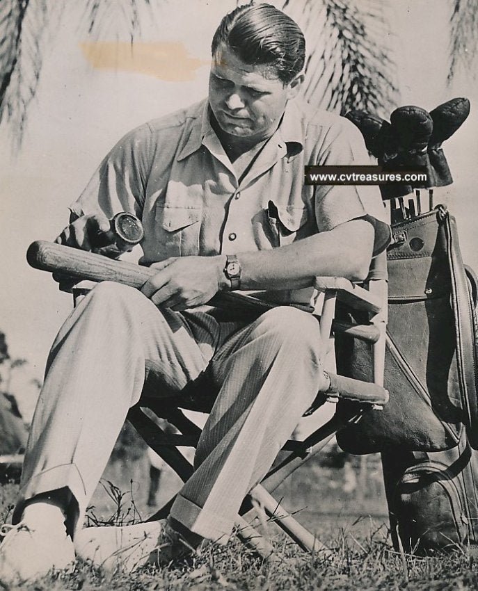 A Vintage 1940 Original Photograph issued by the Associated Press depicting Jimmie Foxx of the Boston Red Sox taking a break from golf as he prepares his weapon of his trade - his Louisville Slugger bat by "honing" it with a glass soda pop bottle. This long lost art was common practice back in the day when players would hardened the wood of their bat by rubbing the surface with deer bones and beer bottles to prevent splits and breakage. Original press stamp and caption with FEB 20 1940 stamp date are on the reverse of this terrific photo !