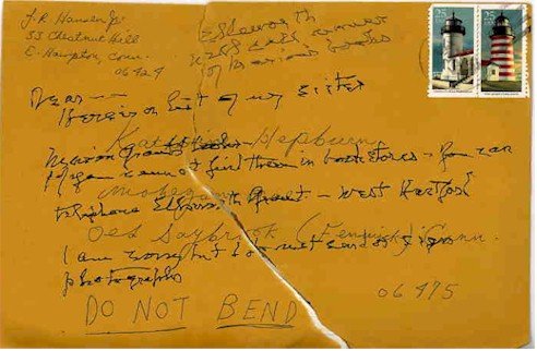 Here is an envelope addressed to Katharine Hepburn where she writes on the front; "Dear-- Here is a list of my sister. Marion Grants books- If you can at find these in book stores you can telephone Ellsworth Grant- West Hartford, I am sorry but I do not send or sign photographs." Torn in half.