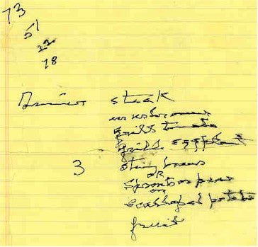 Here is handwritten notes by Katharine Hepburn. It is her shopping list of things to purchase at the grocery store. All written in her hand in black felt tip ink.