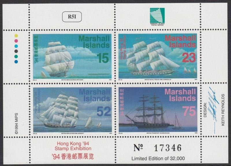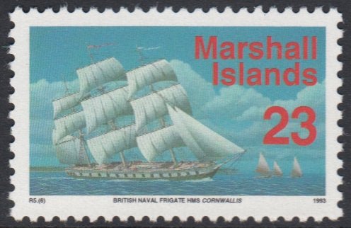 NOTE: *This painting originally appeared on the Republic of the Marshall Islands 23c British Naval Frigate HMS Cornwallis stamp issued October 14, 1993. See the stamps as issued in 1993 in the enlargebale images below