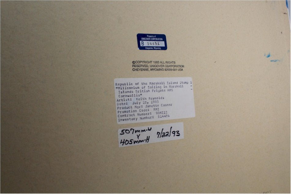 Note: Very few original Keith Reynolds paintings appear on the market. Most of what you will see are prints and lithographs of his paintings. This Original painting was actually used for the Marshall Islands 23c British Naval Frigate HMS Cornwallis stamp issued October 14, 1993.