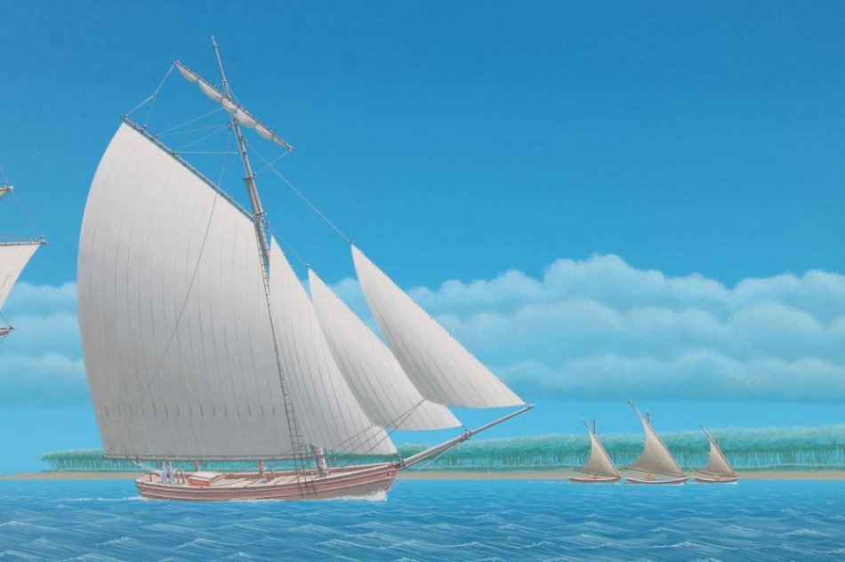 Prompted by both mercantile and scientific interests in the Pacific, Russia launched a string of naval expeditions throughout Micronesia during the late 18th and early 19th centuries. One such voyage involved the Russian Brig Rurick, accompanied by a tender in its depiction in this painting. Ordered to explore the Marshall Islands, the Rurick's commander, Lieutenant Otto von Kotzebue spent three months in early 1817 visiting the eastern Ratak chain. There the ship's crew carried on trade and updated their maps of the area, giving the islands Russian names. French artist Louis Choris, also part of the expedition, spent his time busily sketching the islanders' daily activities. Later that year, von Kotzebue returned to the Marshalls for a brief stop before sailing home to Kronstadt.