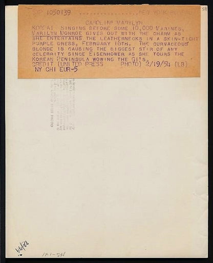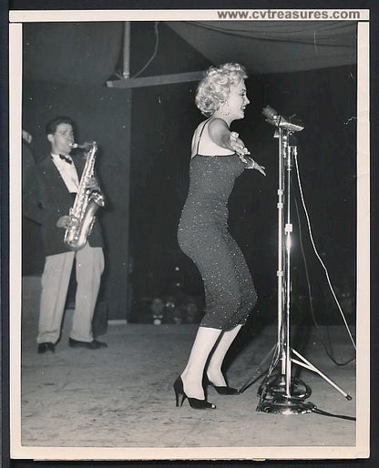 A Vintage 1954 Original Photo capturing star actress Marilyn Monroe on stage during her famous appearance in Korea to entertain the troops. Monroe performed a quickly thrown-together show titled ‘Anything Goes’ to audiences which totaled over 100,000 men over 4 days. Original press stamp and caption with date are on the reverse of this period photo at the time she was in her prime as the hottest actress in Hollywood. A terrific photo in relation to one of the events that defined her legacy !