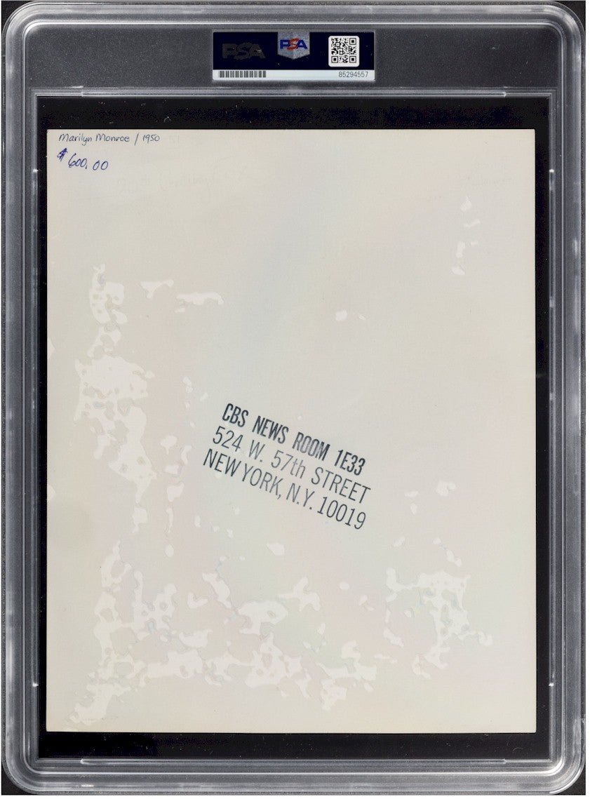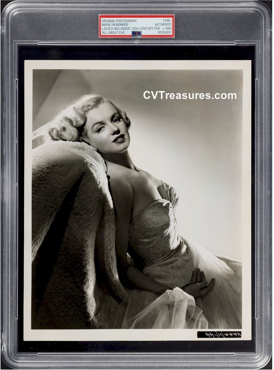 Marilyn Monroe in All About Eve (20th Century-Fox, 1950) 10" x 8" Original Portrait Gallery Photograph by Laszlo Willinger. PSA/DNA Type 1. Vintage gelatin silver glossy 10" x 8" studio release portrait gallery photograph of Marilyn Monroe in All About Eve by Laszlo Willinger, with CBS News Room wet stamp on the verso. Production code F999-S-155 in India ink in the negative