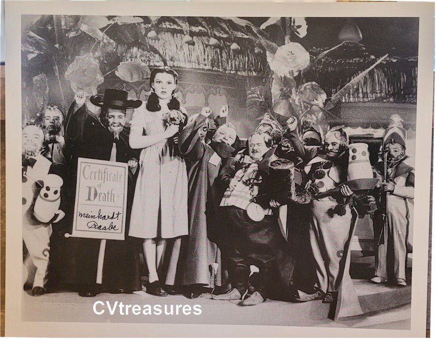 Meinhardt Raabe was one of the iconic Munchkin members of the Wizard of OZ. Here is a great autographed photo as the "Coroner" where he signs on the "Wicked Witch's" Death Certificate. I met Mr Raabe at a collector show about 35 years ago and acquired this signed photo directly from him.