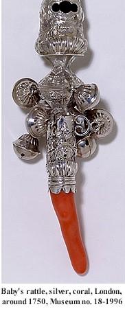 This was an expensive all-in-one entertainment and health kit for a baby. The whistle and rattle offered the chance to make a lot of noise while the coral was cool against the child’s gums when teething and acted as an amulet to ward away evil spirits. In 1706 the Countess of Lauderdale bought 'a silver gumstick with bells and a piece of fine coral' for £1. We have included a similar rattle image here.
