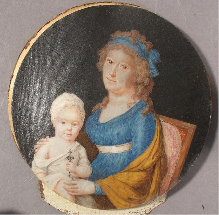 The subject matter is a mother and child, Continental (French, etc). In addition to 18th century clothing, the baby is also holding a sterling baby rattle with bells. This style of rattle dates to the mid 18th Century. Baby's rattle Silver, coral London, around 1750.