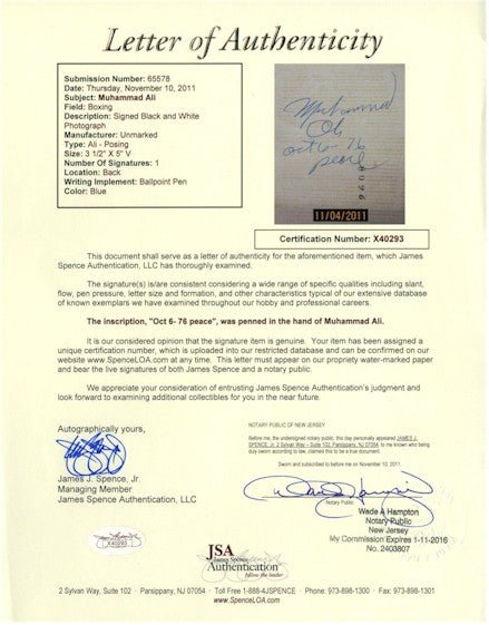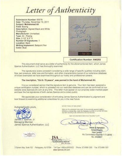 Terrific genuine JSA Authentivcated Muhammad Ali signature, with great inscription and dated in his hand, "Muhammad Ali, Oct 6, 76, Peace".