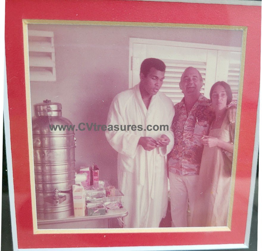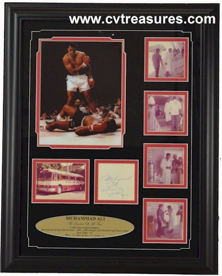 3.5 x 3.5" vintage signed cut (1976) framed and matted with four original color snapshot photographs and 8 x 10 photo of Ali. The snapshots pre-date the signed cut. The Ali cut is in bold blue ballpoint, however there are some faint brown horizontal lines as it was once stored in a vintage photo album. Professionally framed and matted with an informational plaque with Ali's career stats. 20 x 25" overall. Full JSA LOA.