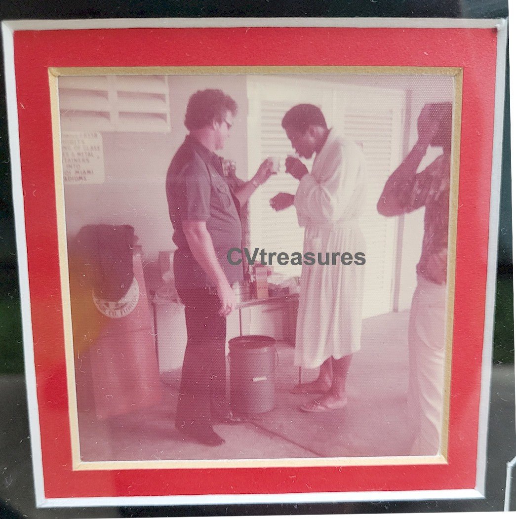 This great vintage signature has been matted and framed with an 8x10" photo of the fight with Sonny Liston, along with five original RARE candid snapshot photos of Ali , apparently at training camp and his bus. Photos appear to be from late 1960s/early 70s.. Beautiful museum quality framing. The autograph has been certified authentic by the leading authentication service JSA and comes with full LOA.