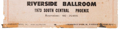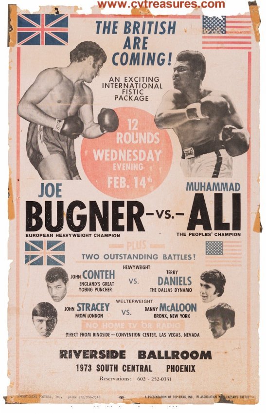 1973 Muhammad Ali vs Joe Bugner I Closed-Circuit Poster (Riverside Ballroom). "The British Are Coming! An exciting International Fistic Package...European Heavyweight Cham[ion vs. The People's Champion." Remote viewing at the Riverside Ballroom in Phoenix. Paper loss and degradation of the borders, particularly the top, but the main portion is intact. The most noticeable flaws could be easily matted out in a frame. 22x14". Shrink wrapped on white foam board for easy storage and display. Letter of provenance from Troy Kinunen.