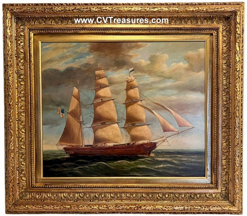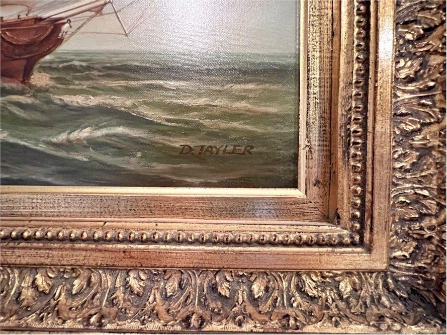D. Tayler (Massachusetts) seascape oil painting on canvas of an American Colonial clipper ship abroad. Mounted in a hand carved gilt wooden frame. Signed to lower right. Measures: 24" W x 20" H. Frame: 34-1/4" W x 30-1/4" H.