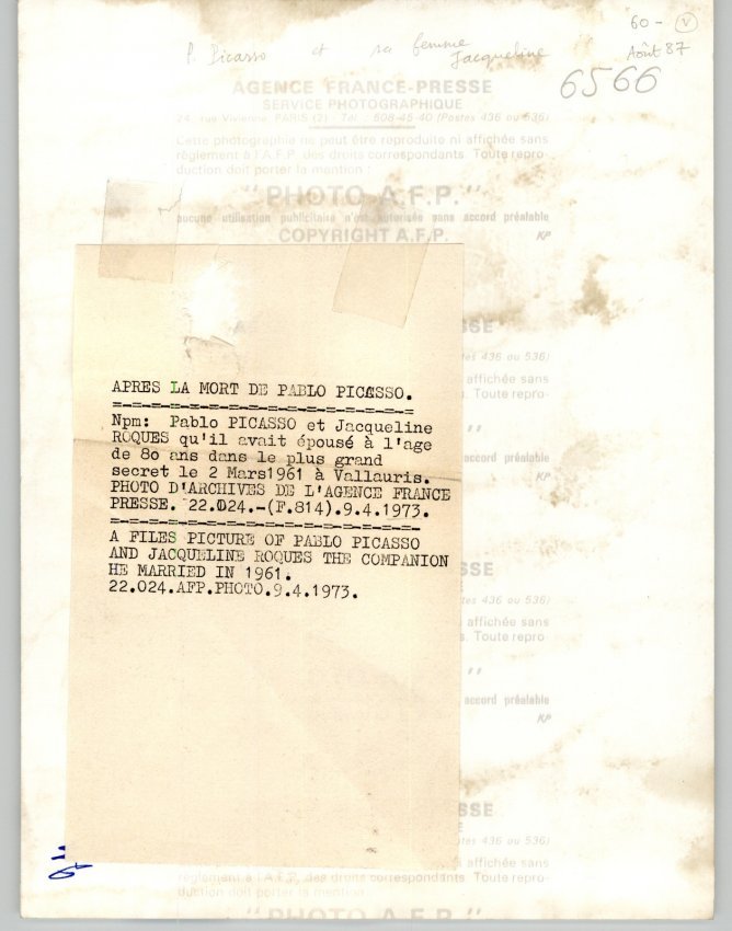Has original France Press AFP photo stamp on back from the 1960s. A later filed snipe from 1973 just a couple months after his passing is also attached, most certainly used for Press release of his death.