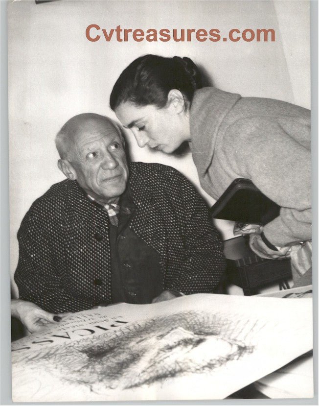 Original 1960s Photo of Pablo Picasso and what looks like a promottional poster lithograph for his Art Exhibit as his wife offers her opinion of which Picasso appears most intersted in