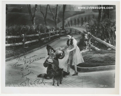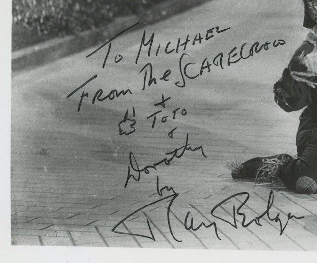 Extraordinary and extremely Rare and Extraordinary Autographed "Wizard of OZ" photo by the Scarecrow himself Ray Bolger. Although we’ve owned a number of signed Bolger photos over the past 40 years, this one is particularly special in that Mr Bolger adds a Very Rare inscription, “from The Scarecrow + Toto + Dorothy, Ray Bolger”. And what appears a small drawing of a dog or dog’s paw next to “Toto”. An amazing Oz Find!