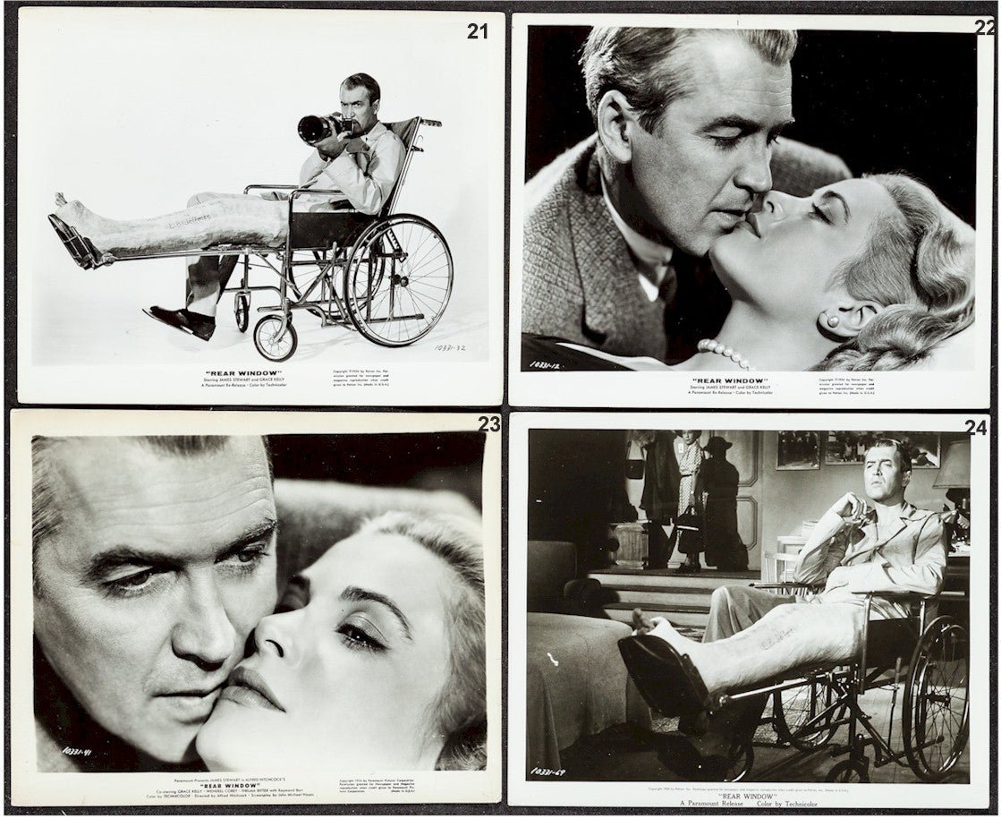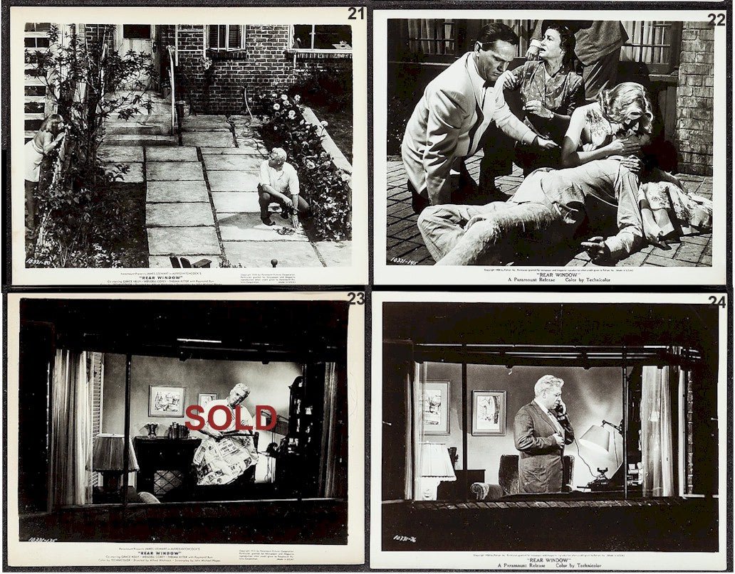 Vintage silver gelatin, single weight, glossy finish photos. Starring James Stewart, Grace Kelly, Raymond Burr, Thelma Ritter, Wendell Corey, Judith Evelyn, Ross Bagdasarian, Georgine Darcy, Sara Berner, and Frank Cady. Directed by Alfred Hitchcock. Unrestored photos with clean overall appearances. They may have general signs of use, such as slight edge wear, light creases, or minor tears. Two of the photos are marked as reissues but still have the original 1954 dates on them. Most are in Excellent-Excellent+ Condition