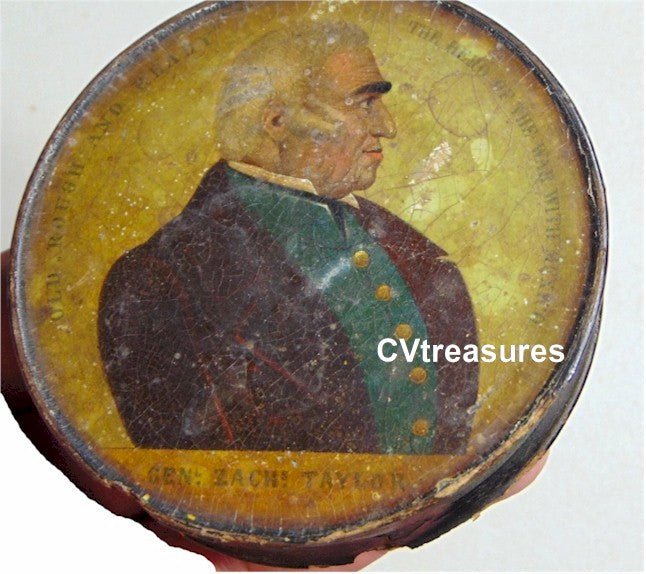 The Zachary Taylor papier-mâché snuff box is a notable example of mid-19th-century American political memorabilia, crafted around the time of Taylor's 1848 presidential campaign. These snuff boxes, typically measuring approximately 3.25 to 3.5 inches in diameter, feature a bust of General Zachary Taylor on the lid, accompanied by inscriptions such as "Old Rough and Ready" and "The Hero of the War with Mexico," referencing his popular nickname and military achievements during the Mexican-American War. Great artwork of Taylor on the lid.